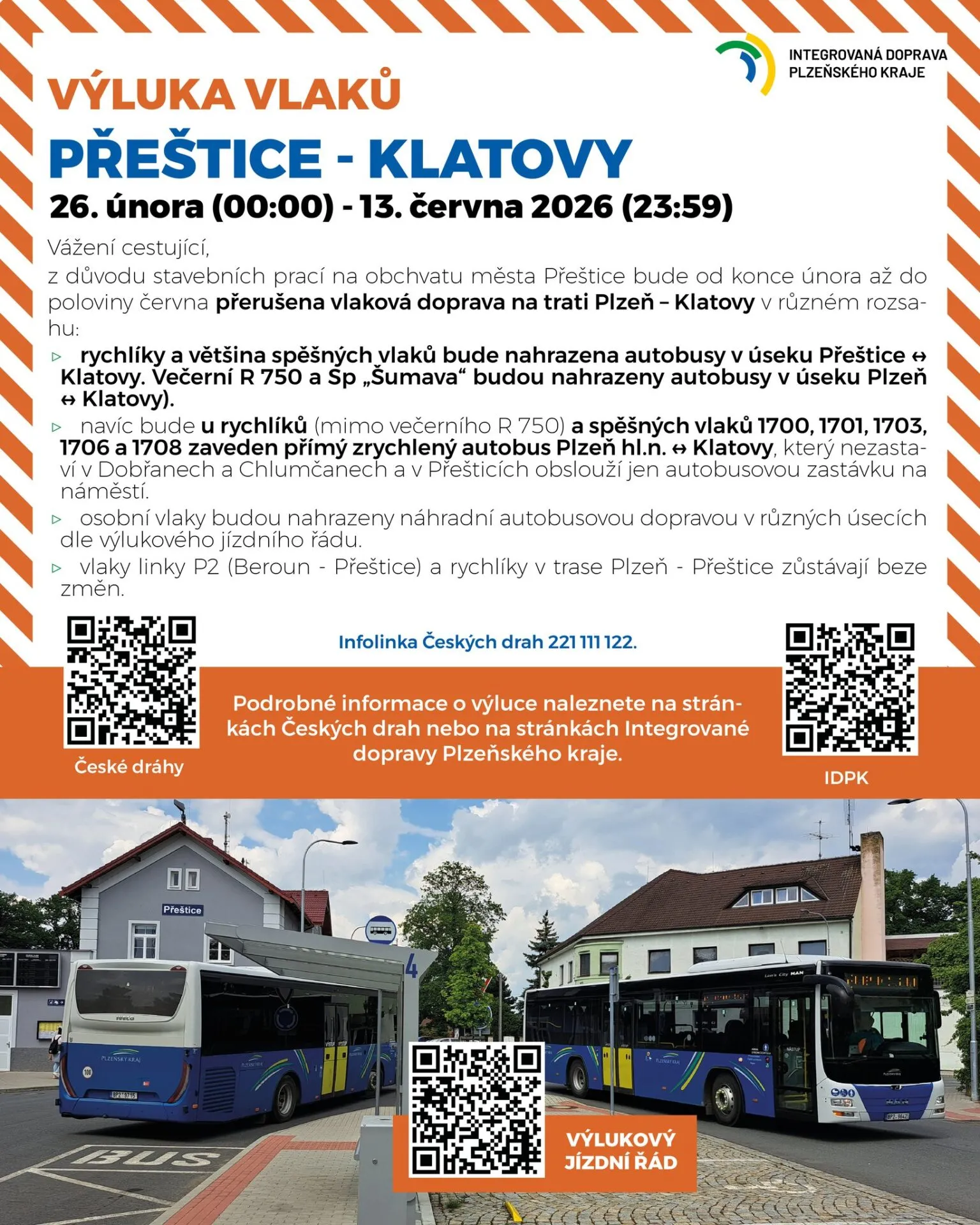 Pokračující výstavba přeštického obchvatu si od pátku 26. 2. vyžádala dlouhodobou plánovanou výluku na trati Plzeň – Přeštice – Klatovy.