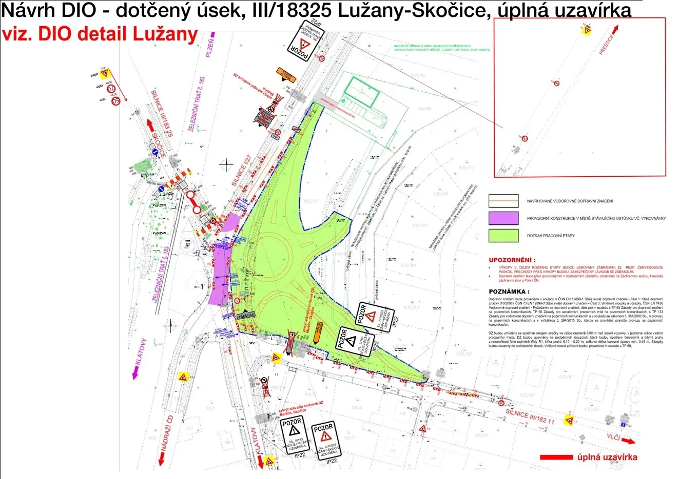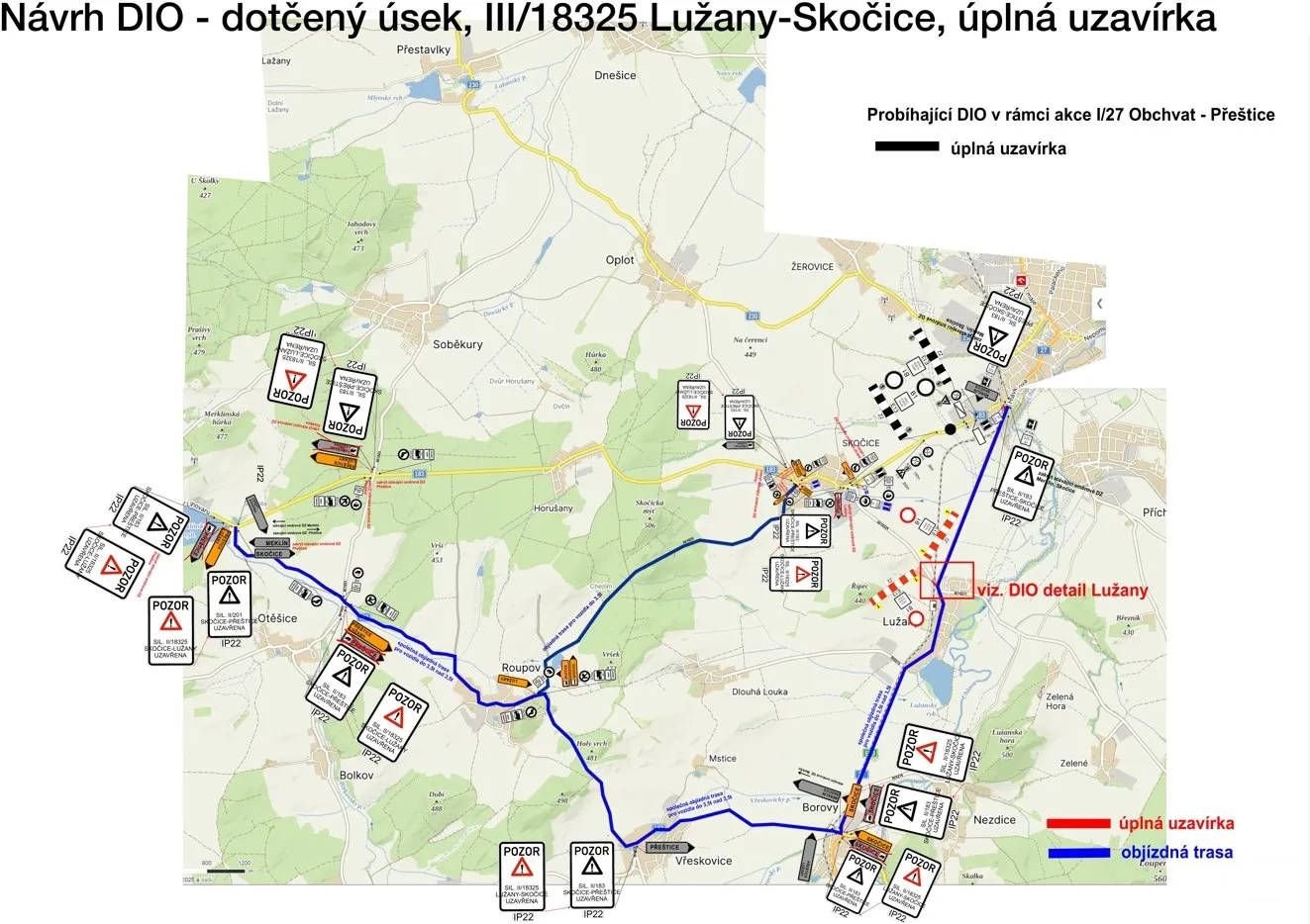 Souběžně se stavebními pracemi bude probíhat i přeložka podzemního vedení nízkého napětí. V první fázi stavby, která potrvá do konce května, zůstane silnice I/27 průjezdná v obou směrech, jen se zúžením vozovky a sníženou maximální povolenou rychlostí. Na křížení s hlavním tahem bude ale uzavřena silnice III/18325 ve směru na Skočice. Odbočení zde nebude možné a řidiči budou muset využít objízdné trasy.